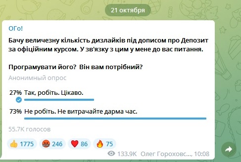 Спочатку на хайпі новинку у своїх соцмережах анонсував фронтмен monobank Олег Гороховський. Але його анонс «задізлайкали», що дало йому зручний привід дати задню. Банкір провів опитування у Telegram, чи варто впроваджувати «гібридний депозит». Майже три чверті респондентів проголосували проти. Новинка так і не з’явилася у додатку необанку. Дарма, що репрезентативність опитування викликає сумніви: вибірка замала та й голосувати могли не лише клієнти…