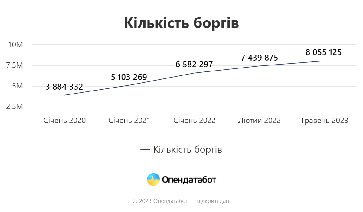 "Кількість боргів (у реєстрі) перетнула межу 8 млн, тоді як у лютому 2022 року їх нараховувалося 7,44 млн", – йдеться у повідомленні.