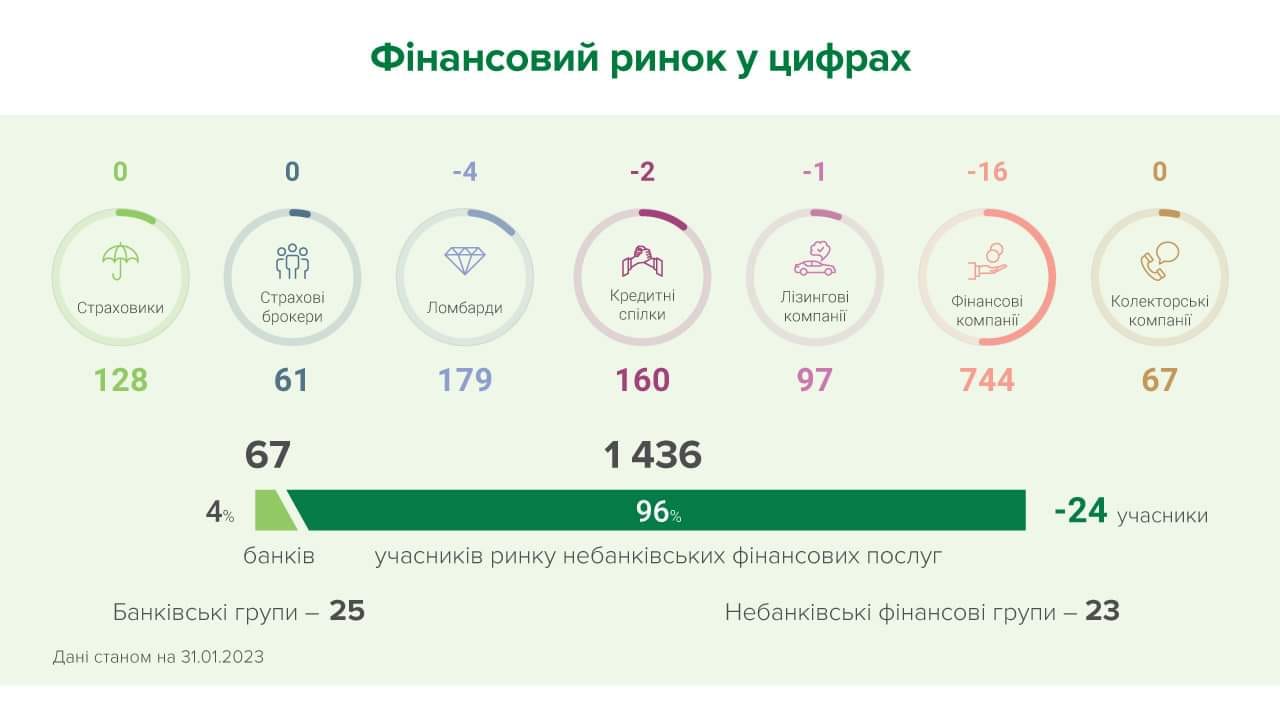 Як повідомлялося, у грудні 2022 року кількість учасників небанківського фінансового ринку зменшилася з 1 522 до 1 459 (на 63 компанії), а кількість банків залишалася незмінною (67).