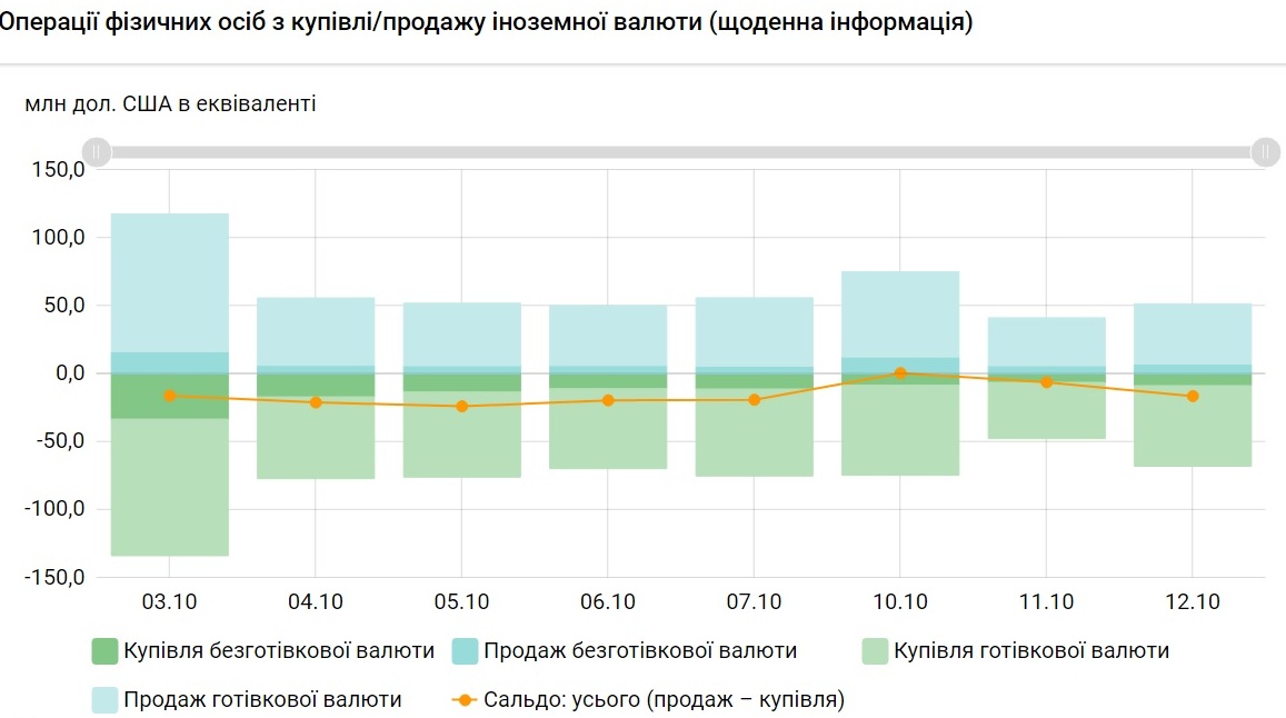 Та вже на минулих вихідних відбувся значний спад. За три дні 8-10 жовтня фізособи придбали безготівкової валюти усього на $8,2 млн.