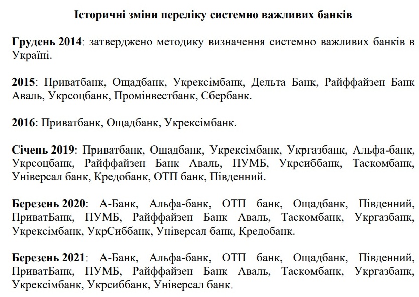Впервые список системных банков был опубликован НБУ в 2015 г. Он состоял из 8 банков. Половины из них уже не существует. Дельте дали обанкротиться, российские Сбербанк и Проминвестбанк вывели с рынка в начале полномасштабной войны. Укрсоц поглотила Альфа.