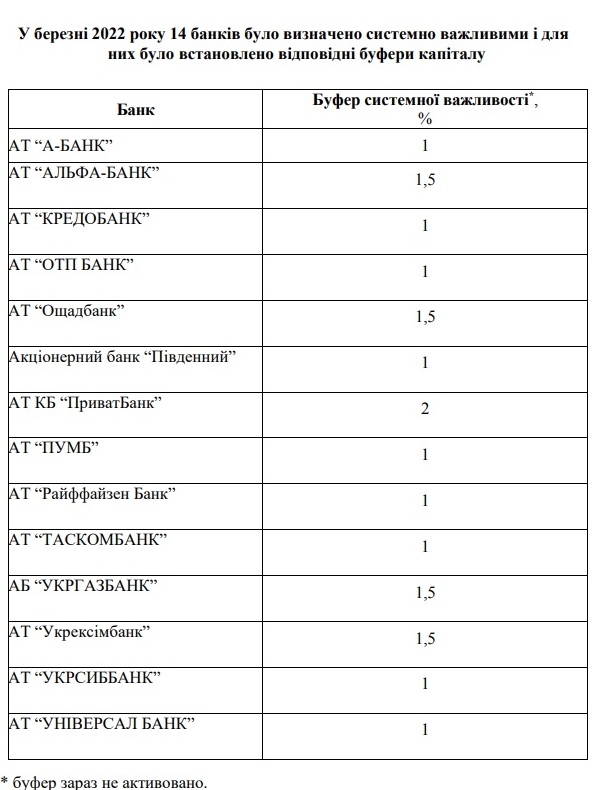 Этот буфер повышает способность банка покрывать неожиданный ущерб, что снижает риск дефолта и масштаб его последствий. Размер буфера системной значимости зависит от показателя системной значимости банка. Самый большой он у Приватбанка (2%). Далее следуют другие госбанки плюс Альфа-Банк (1,5%) у остальных по 1% от основного капитала. Однако сейчас из-за войны этого требования не действует.