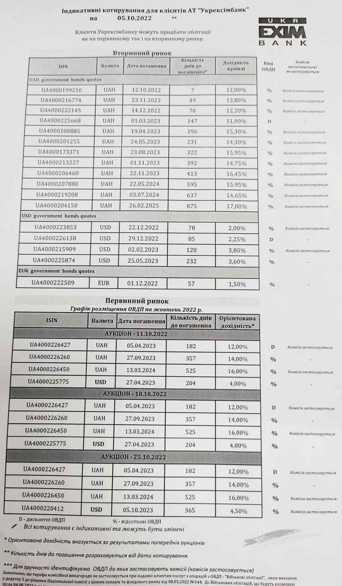 Отправил онлайн-заявку (№9593). На следующий день позвонила менеджер, кажется, Людмила. Она сообщила о возможности приобретения годовых облигаций с доходностью 4,5% на очередном аукционе Минфина, который состоится 25 октября. Следующий аукцион по размещению бумаг с такими параметрами планируется только в декабре. Чтобы успеть нужно подготовить документы, менеджер рекомендовала, как можно скорее наведаться в отделение, напомнив, что во время воздушных тревог они не работают.
