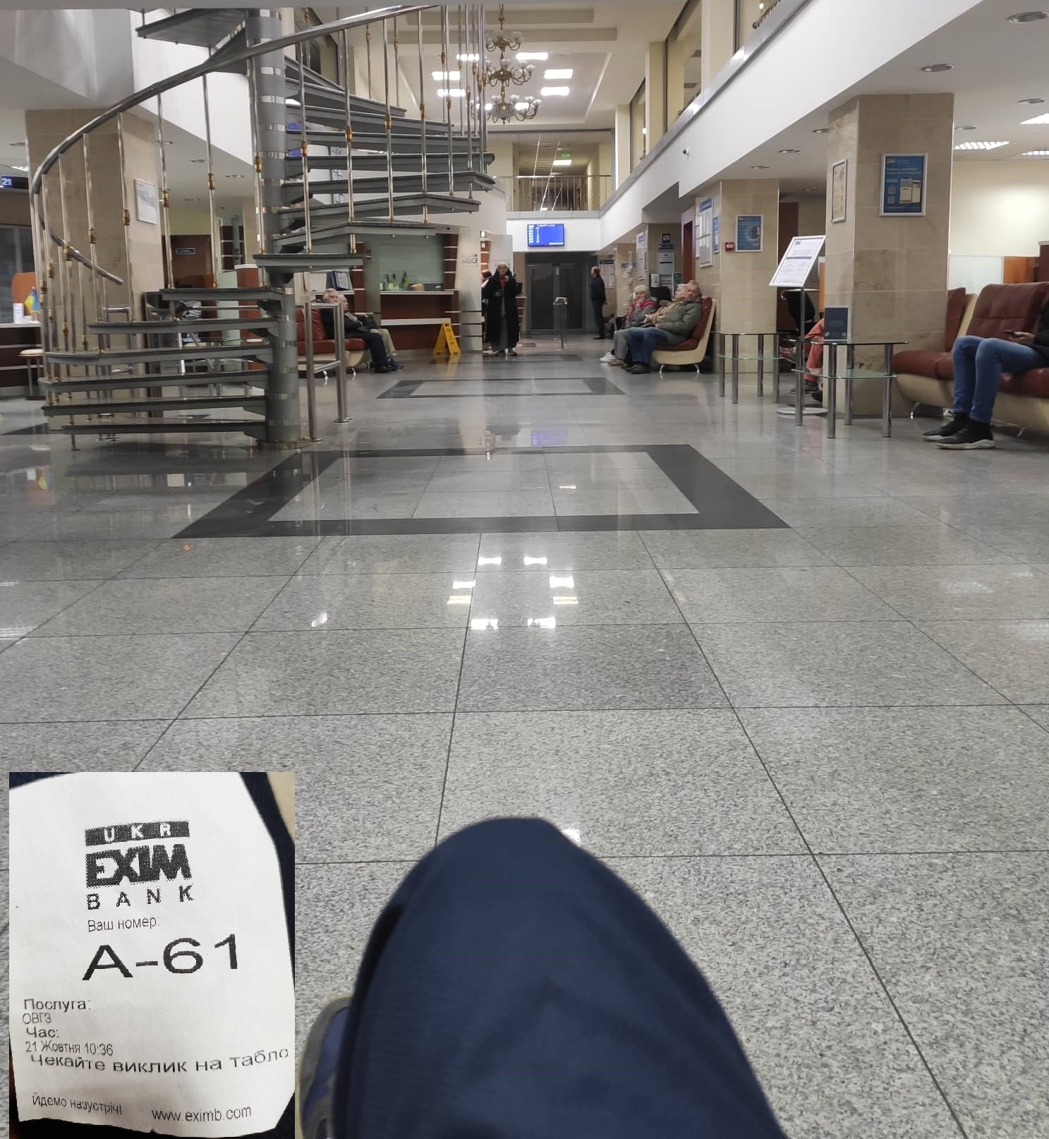 Поэтому утром пятницы (21 октября), зарегистрировавшись в электронной очереди, жду вызова почти час. В диалогах на отделении госбанка значительно преобладает язык страны агрессора. К ксероксу то и дело бегает сотрудница с яркой татуировкой на бедре, которая хорошо видна через одежду.
