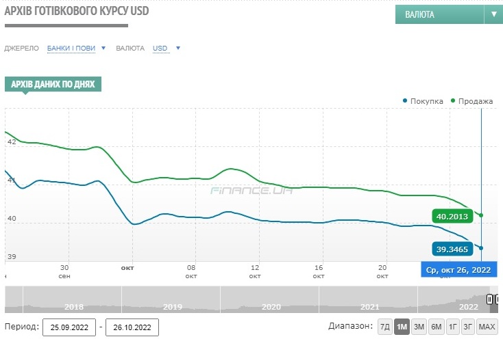 Сегодня, 26 октября, наличный курс продажи «зеленого» у некоторых продавцов упал ниже 40 грн/$, тогда как месяц назад за него иногда просили до 44 грн. Кроме того, на мировом рынке евро снова достиг паритета с долларом.