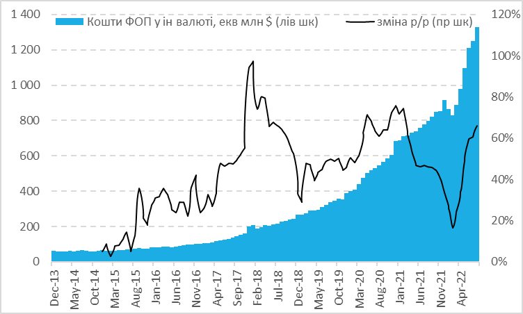 Хочу сказати, що ця тенденція не може тривати вічно. Бо так чи інакше, запаси гривні будуть поступово вичерпуватись, і валюта з рахунків фопів буде продаватися та конвертуватися в гривню. Коли це відбудеться - питання тієї гривневої подушки, яку ті айтішні фопи змогли накопичити починаючи з 24 лютого.