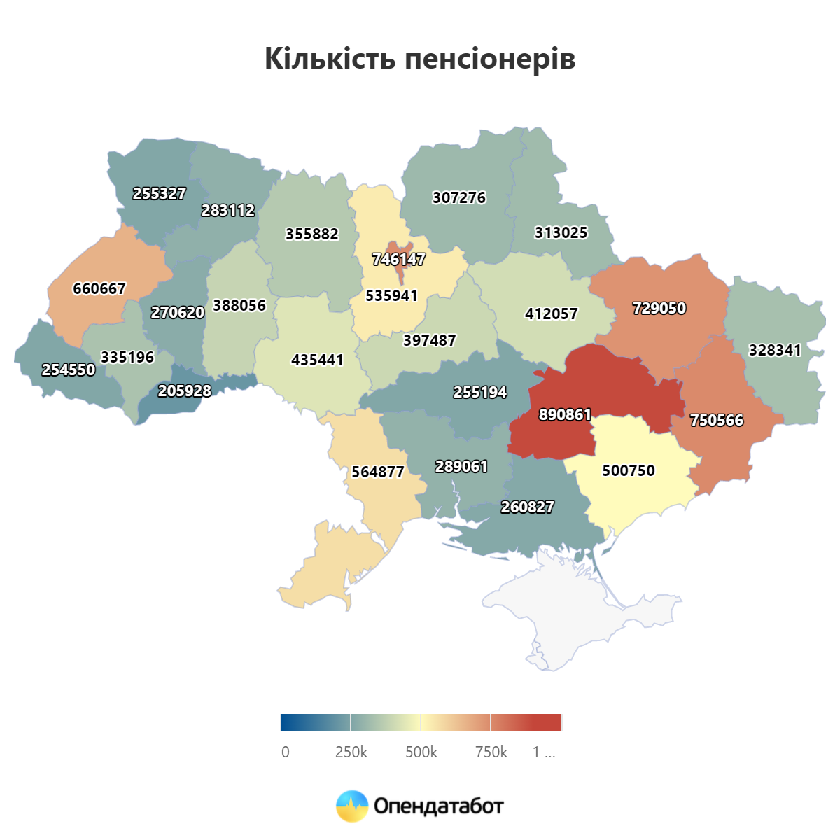 Больше всего пенсионеров проживает в Днепропетровской области – 891 тыс., в Донецкой – 751 тыс., в Киеве – 746 тыс., в Харьковской области – 729 тыс. человек.