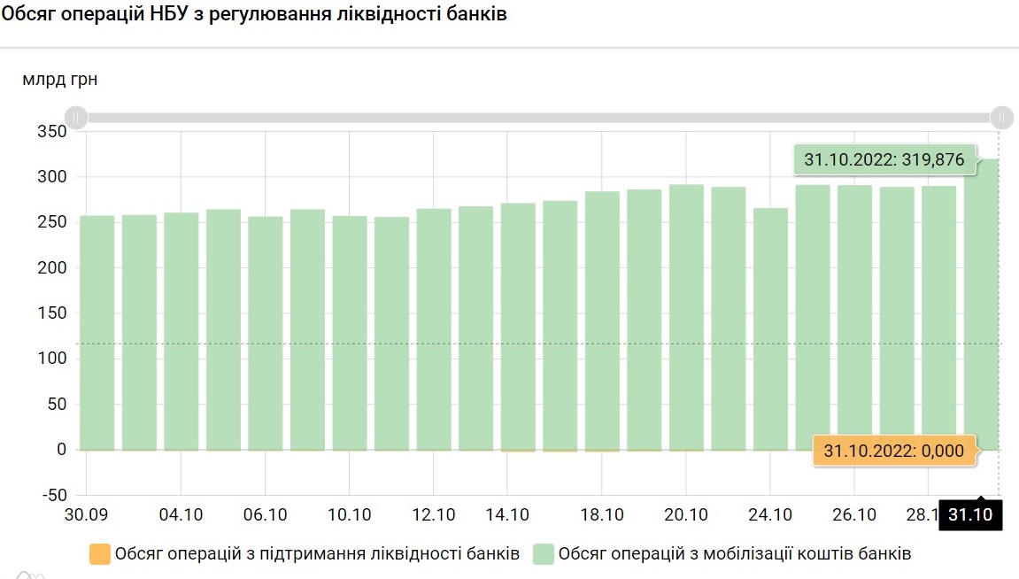 По данным НБУ, на 31 октября (отчетная дата) задолженность Нацбанка перед комбанками по собственным депозитным сертификатам составила 319,9 млрд грн. В то время как предыдущий максимум составлял 291 млрд грн. При этом в течение октября этот показатель не опускался ниже 256 млрд грн. Сертификаты НБУ покупают почти все отечественные банки, правда, львиная доля объемов приходится на несколько крупных игроков.